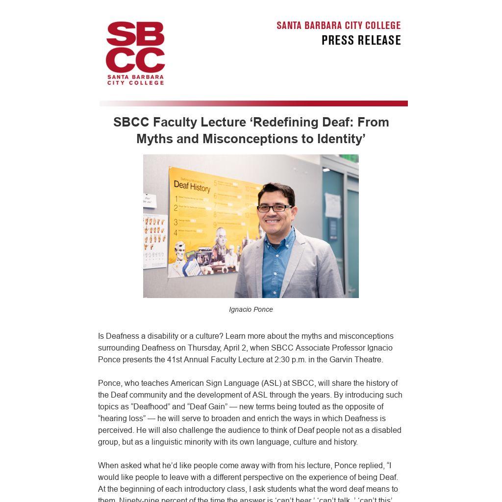 Is Deafness a disability or a culture? Learn more about the myths and misconceptions surrounding Deafness on Thursday, April 2, when SBCC Associate Professor Ignacio Ponce presents the 41st Annual Faculty Lecture at 2:30 p.m. in the Garvin Theatre.