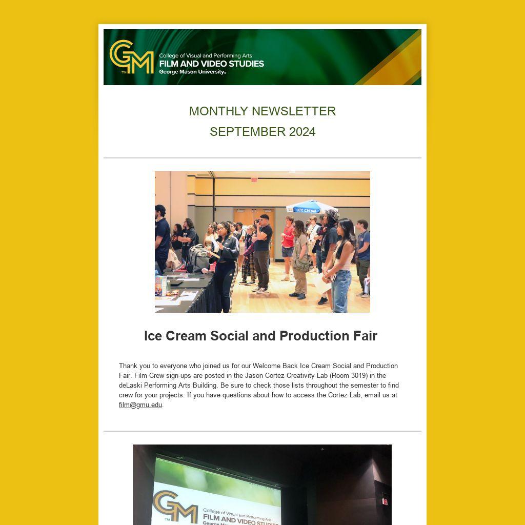 Thank you to everyone who joined us for our Welcome Back Ice Cream Social and Production Fair. Film Crew sign-ups are posted in the Jason Cortez Creativity Lab (Room 3019) in the deLaski Performing Arts Building. Be sure to check those lists throughout the semester to find crew for your projects. If you have questions about how to access the Cortez Lab, email us at film@gmu.edu.