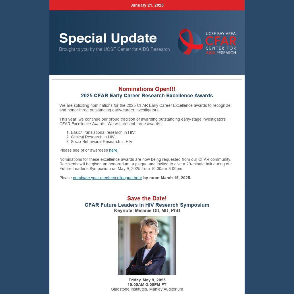 Nominations for these excellence awards are now being requested from our CFAR community. Recipients will be given an honorarium, a plaque and invited to give a 20-minute talk during our Future Leader's Symposium on May 9, 2025 from 10:00am-3:00pm.