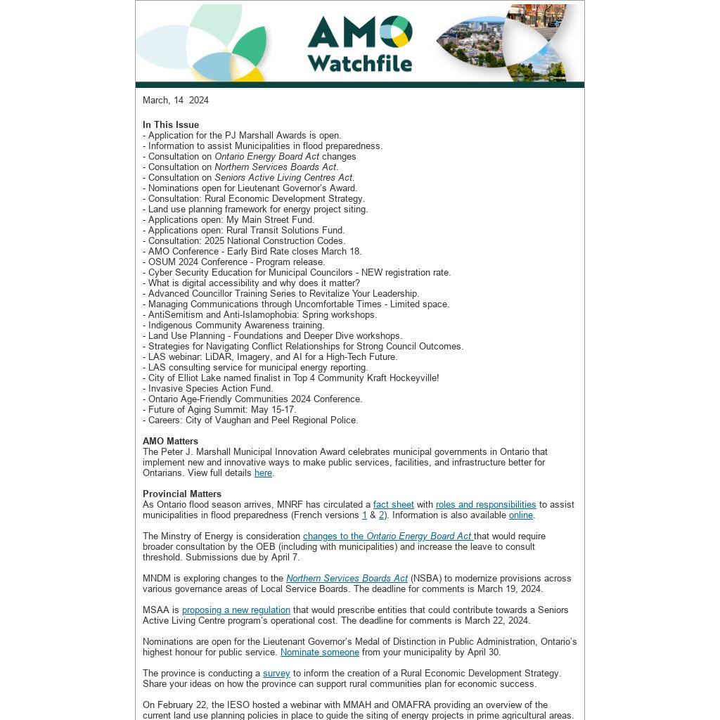 *Disclaimer: The Association of Municipalities of Ontario (AMO) is unable to provide any warranty regarding the accuracy or completeness of third-party submissions. Distribution of these items does not imply an endorsement of the views, information or services mentioned.