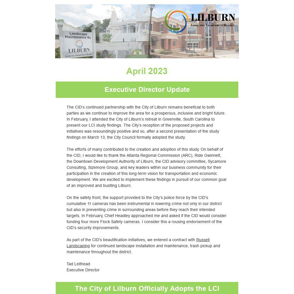 The City of Lilburn officially adopted the LCI Study in March after an in-depth, formal presentation of the study’s recommendations. The City intends to use the LCI recommendations as the base for its updated Comprehensive plan and, in support of the updating process and proposed recommendations, has appointed LCID Executive Director Tad Leithead to serve on the City’s Comprehensive Planning board as a liaison between the CID and the City.