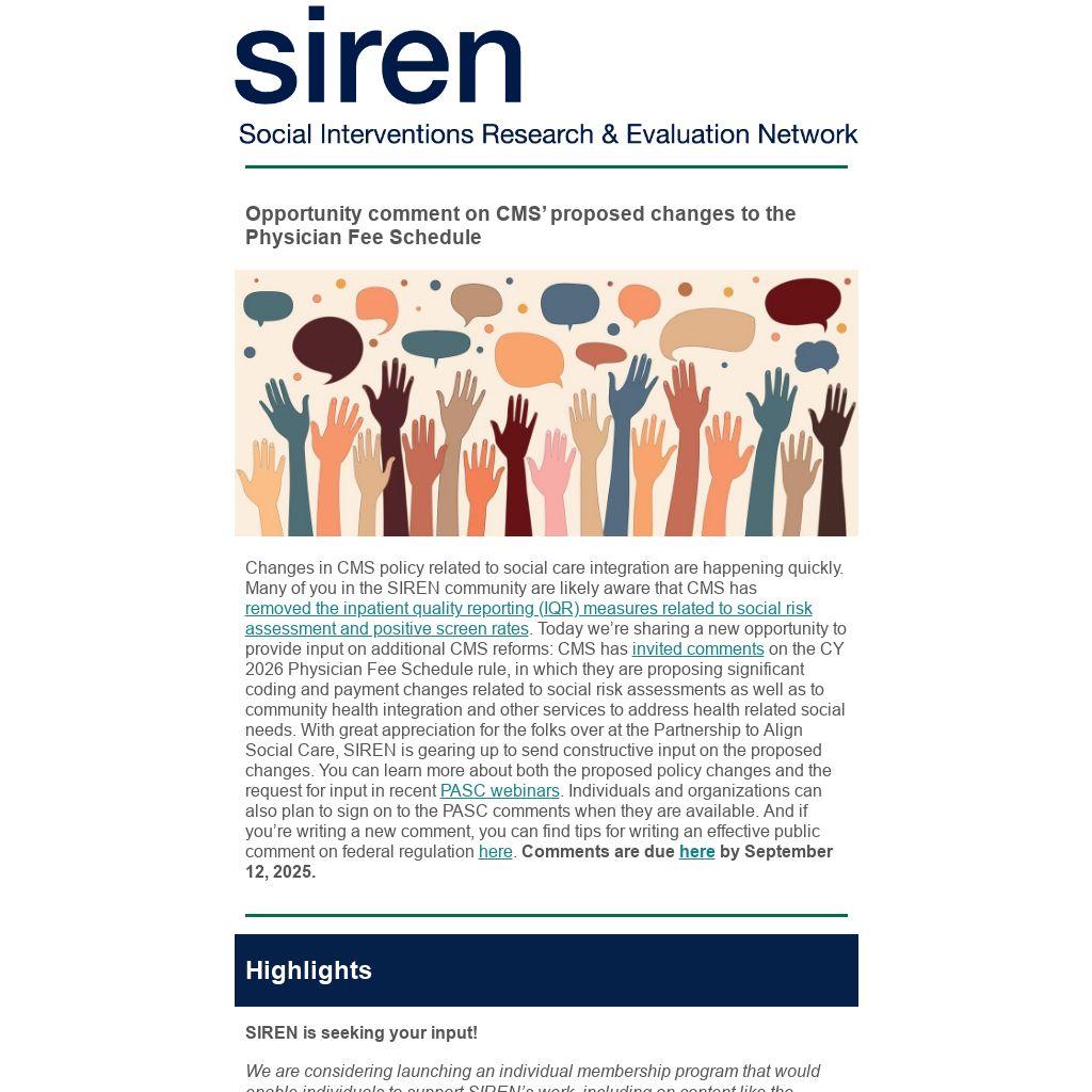 Changes in CMS policy related to social care integration are happening quickly. Many of you in the SIREN community are likely aware that CMS has removed the inpatient quality reporting (IQR) measures related to social risk assessment and positive screen rates. Today we’re sharing a new opportunity to provide input on additional CMS reforms: CMS has invited comments on the CY 2026 Physician Fee Schedule rule, in which they are proposing significant coding and payment changes related to social risk assessments as well as to community health integration and other services to address health related social needs. With great appreciation for the folks over at the Partnership to Align Social Care, SIREN is gearing up to send constructive input on the proposed changes. You can learn more about both the proposed policy changes and the request for input in recent PASC webinars. Individuals and organizations can also plan to sign on to the PASC comments when they are available. And if you’re writing a new comment, you can find tips for writing an effective public comment on federal regulation here. Comments are due here by September 12, 2025.