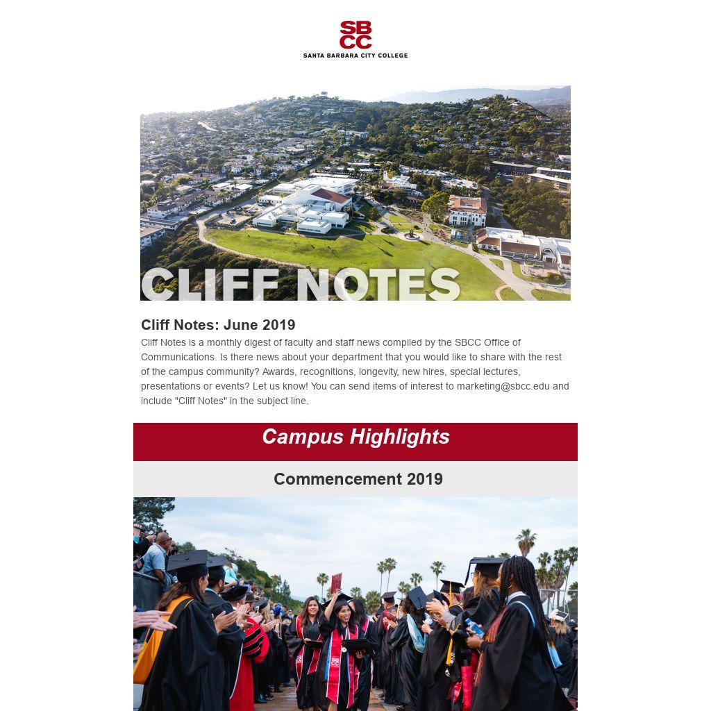 Cliff Notes: June 2019Cliff Notes is a monthly digest of faculty and staff news compiled by the SBCC Office of Communications. Is there news about your department that you would like to share with the rest of the campus community? Awards, recognitions, longevity, new hires, special lectures, presentations or events? Let us know! You can send items of interest to marketing@sbcc.edu and include "Cliff Notes" in the subject line.