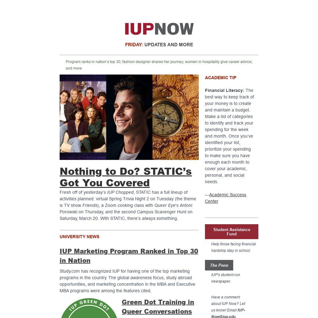 Fresh off of yesterday’s IUP Chopped, STATIC has a full lineup of activities planned: virtual Spring Trivia Night 2 on Tuesday (the theme is TV show Friends), a Zoom cooking class with Queer Eye’s Antoni Porowski on Thursday, and the second Campus Scavenger Hunt on Saturday, March 20. With STATIC, there’s always something.