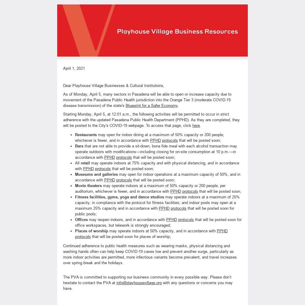 As of Monday, April 5, many sectors in Pasadena will be able to open or increase capacity due to movement of the Pasadena Public Health jurisdiction into the Orange Tier 3 (moderate COVID-19 disease transmission) of the state's Blueprint for a Safer Economy.