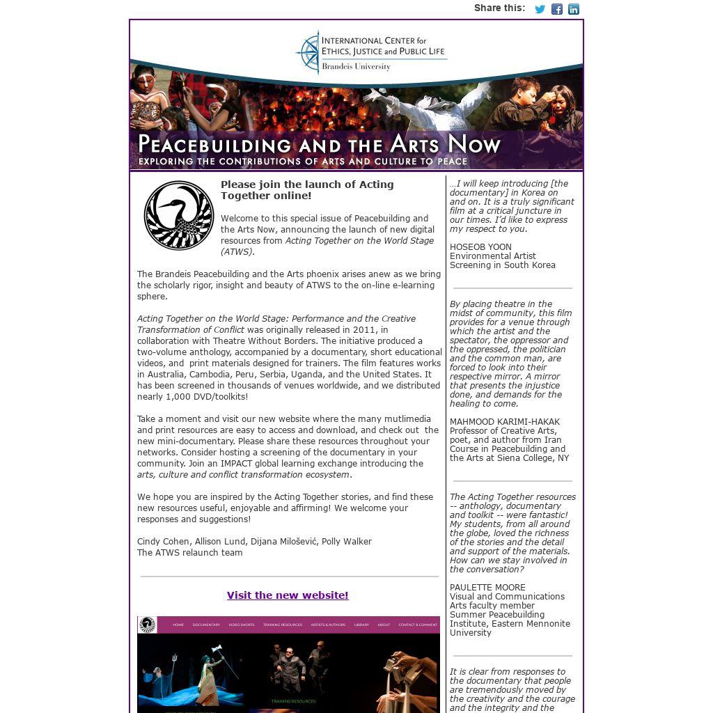 Welcome to this special issue of Peacebuilding and the Arts Now, announcing the launch of new digital resources from Acting Together on the World Stage (ATWS).