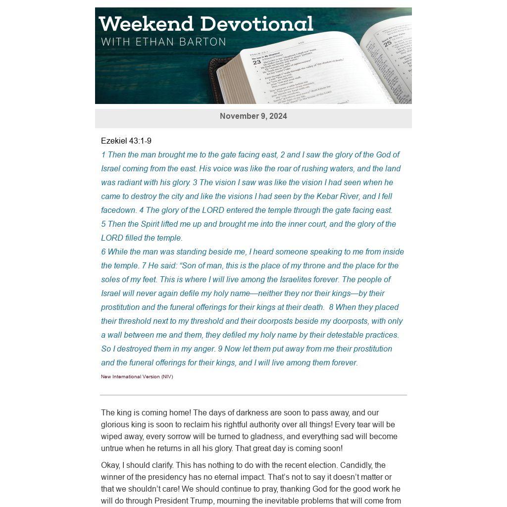 Okay, I should clarify. This has nothing to do with the recent election. Candidly, the winner of the presidency has no eternal impact. That’s not to say it doesn’t matter or that we shouldn’t care! We should continue to pray, thanking God for the good work he will do through President Trump, mourning the inevitable problems that will come from his sinful human nature, and asking the Spirit to fill our leaders with the wisdom to lead well. But don’t forget to also keep your eyes fastened further ahead. Our nation, with all its strengths and weaknesses, will pass away. But our eternal citizenship is in Heaven, and our eternal destiny is in the glory of the Lord—and he, our eternal king, is coming home!
