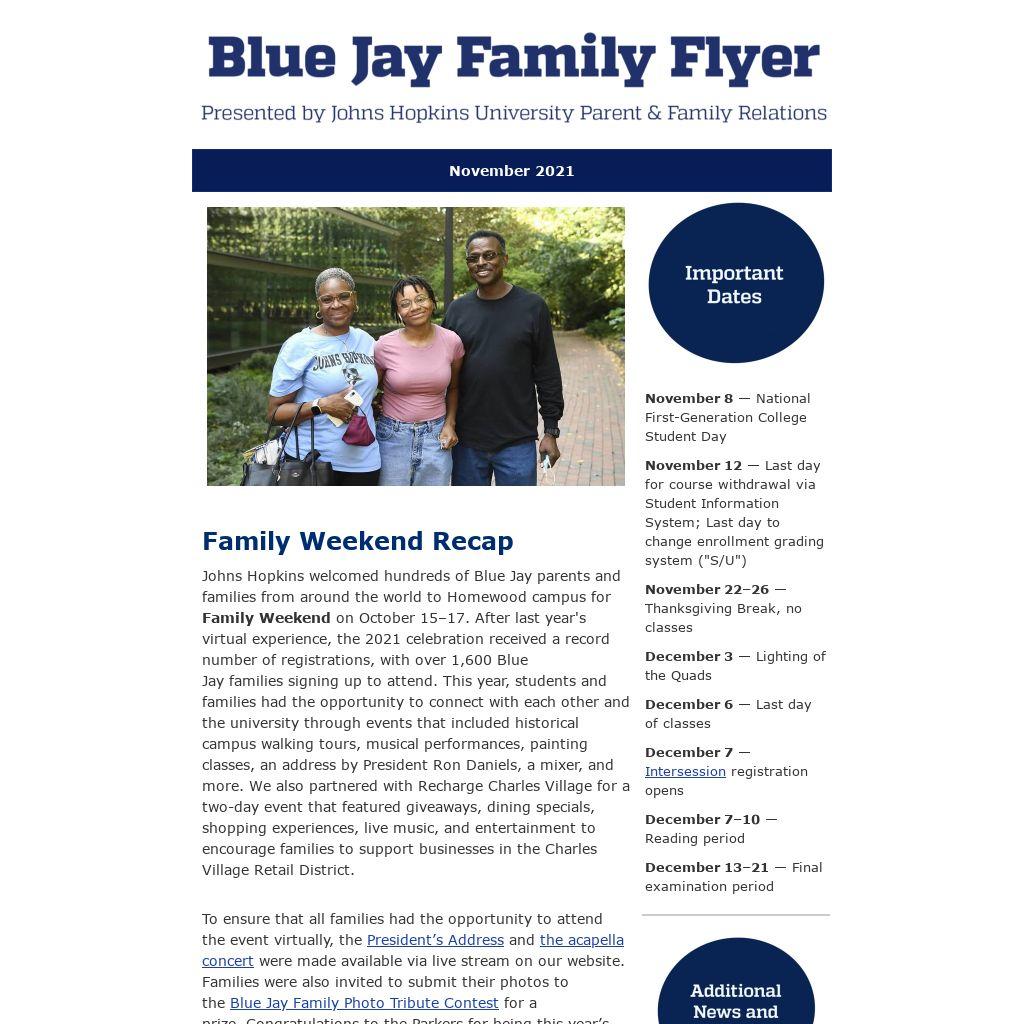 The Blue Jay Family Webinar Series continues this month! The next online seminar is titled "Bouncing Back: Understanding What Your Jay Needs" and is scheduled for Wednesday, November 17 at 7 p.m. ET. The webinar will share tips and strategies for how to help students and families refocus, reconnect, and put more time into their well-being. You can register online to attend.