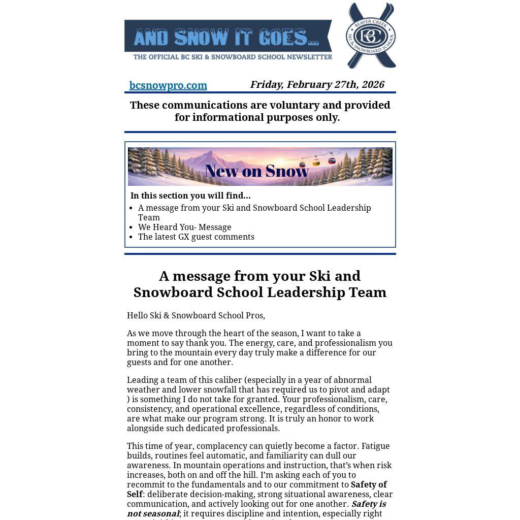 As we move through the heart of the season, I want to take a moment to say thank you. The energy, care, and professionalism you bring to the mountain every day truly make a difference for our guests and for one another.
