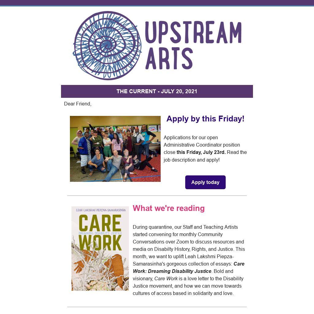 During quarantine, our Staff and Teaching Artists started convening for monthly Community Conversations over Zoom to discuss resources and media on Disabilty History, Rights, and Justice. This month, we want to uplift Leah Lakshmi Piepza-Samarasinha's gorgeous collection of essays: Care Work: Dreaming Disability Justice. Bold and visionary, Care Work is a love letter to the Disability Justice movement, and how we can move towards cultures of access based in solidarity and love.