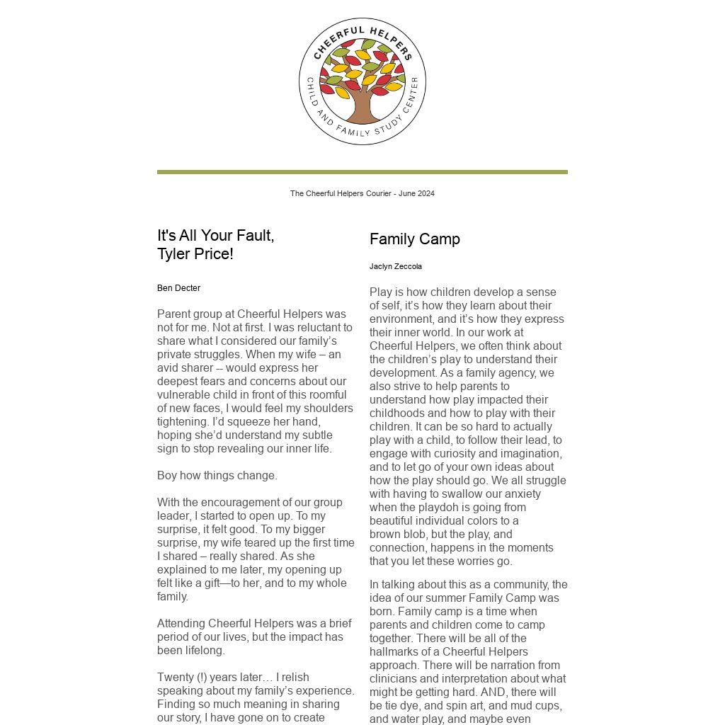 Our family camp this year is July 29-August 2, 2:00-5:00 pm. Please reach out to Sam Zarate, sam.zarate@cheerfulhelpers.org, to register or for more information.
