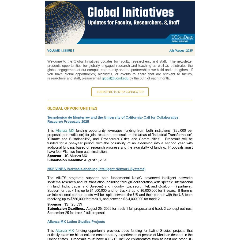 Welcome to the Global Initiatives updates for faculty, researchers, and staff. The newsletter presents opportunities for globally engaged research and teaching as well as celebrates the global engagement of our campus community and the partnerships we build and strengthen. If you have global opportunities, highlights, or events to share that are relevant to faculty, researchers and staff, please email global@ucsd.edu by the 30th of each month.