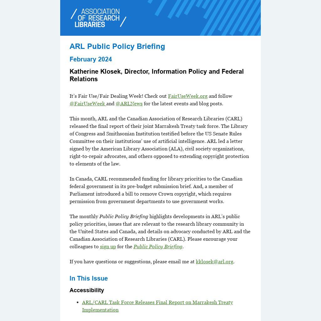 The monthly Public Policy Briefing highlights developments in ARL’s public policy priorities, issues that are relevant to the research library community in the United States and Canada, and details on advocacy conducted by ARL and the Canadian Association of Research Libraries (CARL). Please encourage your colleagues to sign up for the Public Policy Briefing.