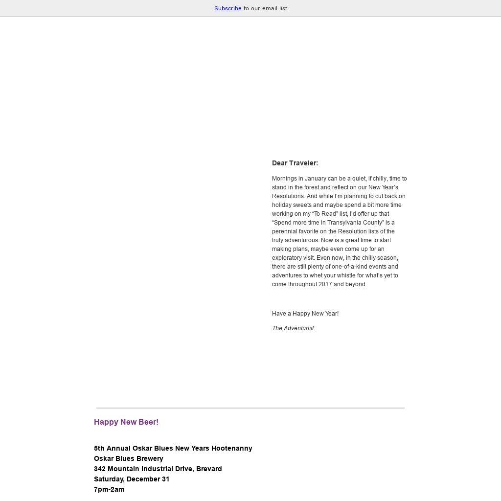 Dear Traveler: Mornings in January can be a quiet, if chilly, time to stand in the forest and reflect on our New Year’s Resolutions. And while I’m planning to cut back on holiday sweets and maybe spend a bit more time working on my “To Read” list, I’d offer up that “Spend more time in Transylvania County” is a perennial favorite on the Resolution lists of the truly adventurous. Now is a great time to start making plans, maybe even come up for an exploratory visit. Even now, in the chilly season, there are still plenty of one-of-a-kind events and adventures to whet your whistle for what’s yet to come throughout 2017 and beyond. Have a Happy New Year!
