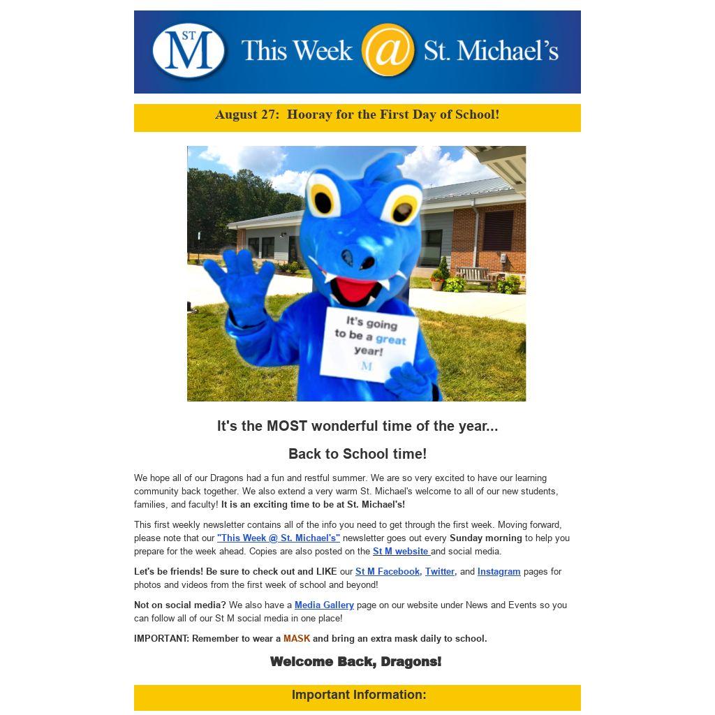 This first weekly newsletter contains all of the info you need to get through the first week. Moving forward, please note that our "This Week @ St. Michael's" newsletter goes out every Sunday morning to help you prepare for the week ahead. Copies are also posted on the St M website and social media.