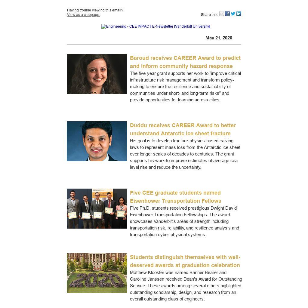 I hope you are doing well and staying healthy! The work of our faculty and students demonstrates how critical civil and environmental engineering solutions are to our lives every day and in the fight against COVID-19. For example, as one of our professors, Dan Work, has noted in over a dozen recent interviews with Reuters, major TV networks and trade publications, commute times in some cities could double as more people choose single occupancy vehicles over mass transit when they return to offices after working from home. Thank you to all the civil and environmental engineers who are developing solutions to address transportation and other challenges facing the country. We also want to celebrate the work of health care professionals and workers all across the country who have made it possible for the nation to flatten the curve. We hope the good news stories about our faculty and students in this newsletter will lift your spirits as we all head into the summer and back to work!