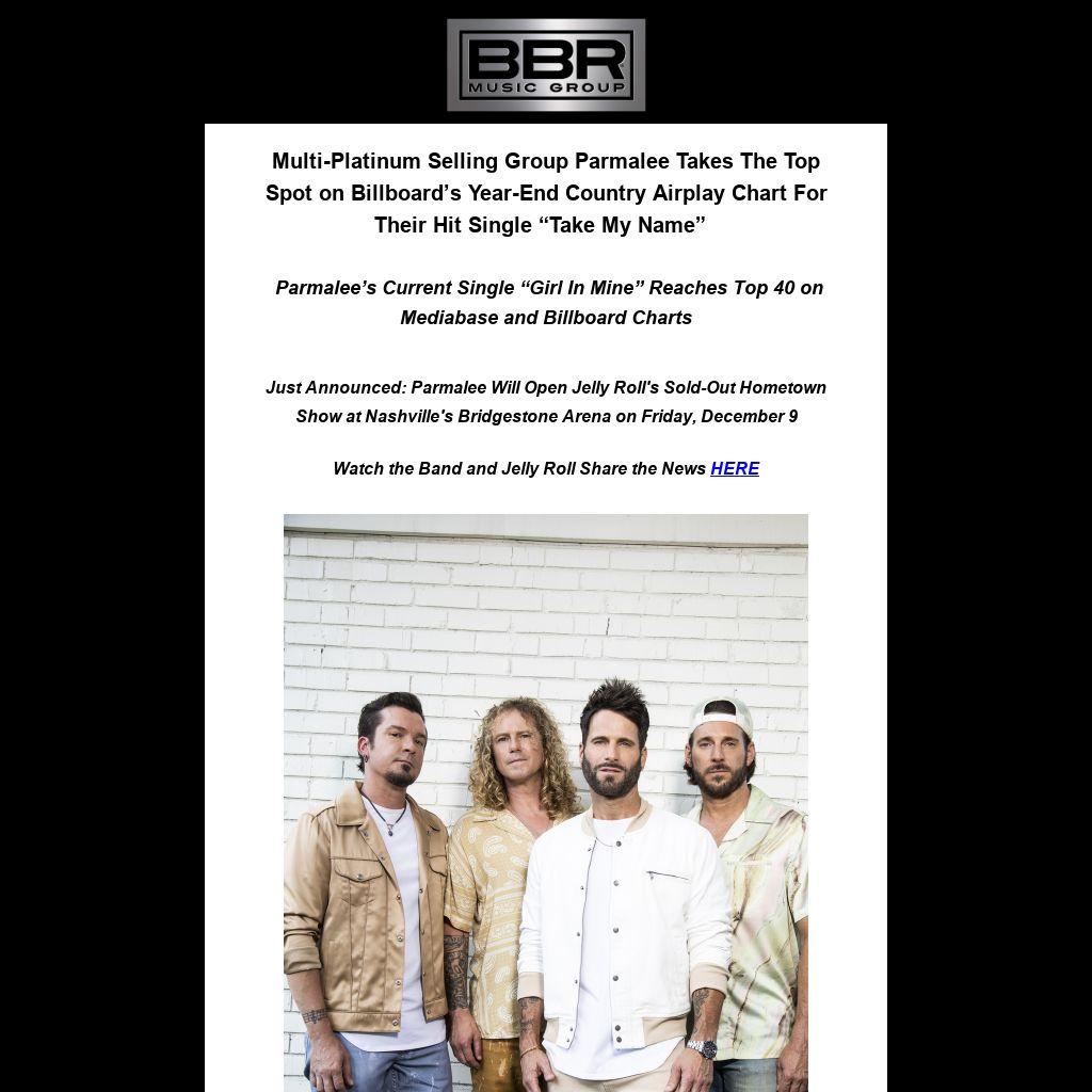 Nashville, TN (December 2, 2022) - Multi-Platinum-selling Country music group Parmalee took the #1 spot on Billboard’s Year-End Country Airplay Chart for their hit single “Take My Name.” The beloved track, co-written by the band’s lead singer, Matt Thomas, alongside Ashley Gorley, Ben Johnson and David Fanning, has been described as a “musical marriage proposal” (Taste of Country) and captures the palpably affirming emotion of finding the person you want to spend forever with. “Take My Name” (which has amassed 259 million on-demand streams to date) remained in the Top 10 for 21 weeks – the fourth longest run in the list’s upper tier in the almost 23-year history of the Billboard Country Chart. The song is currently positioned at #22 on Mediabase Hot AC Chart and is #23 on the Billboard Adult Pop Airplay Chart.