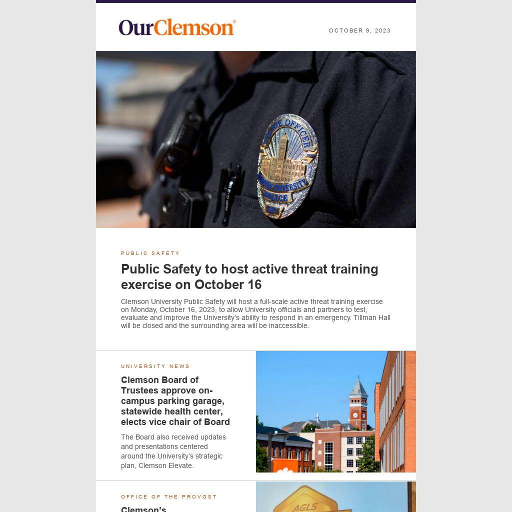 Clemson University Public Safety will host a full-scale active threat training exercise on Monday, October 16, 2023, to allow University officials and partners to test, evaluate and improve the University’s ability to respond in an emergency. Tillman Hall will be closed and the surrounding area will be inaccessible.