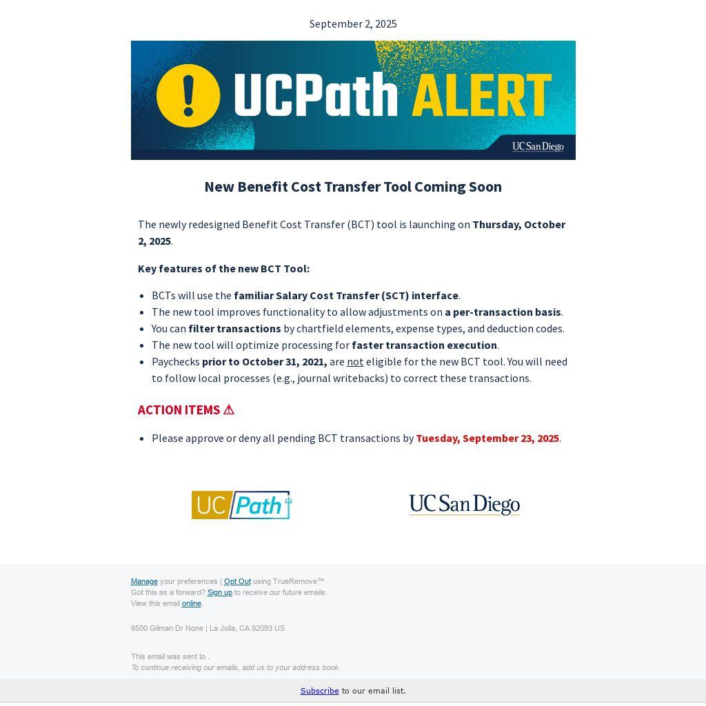 - Please approve or deny all pending BCT transactions by Tuesday, September 23, 2025.
