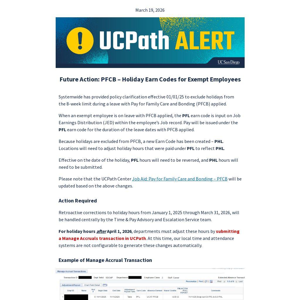 Please note that the UCPath Center Job Aid: Pay for Family Care and Bonding – PFCB will be updated based on the above changes.