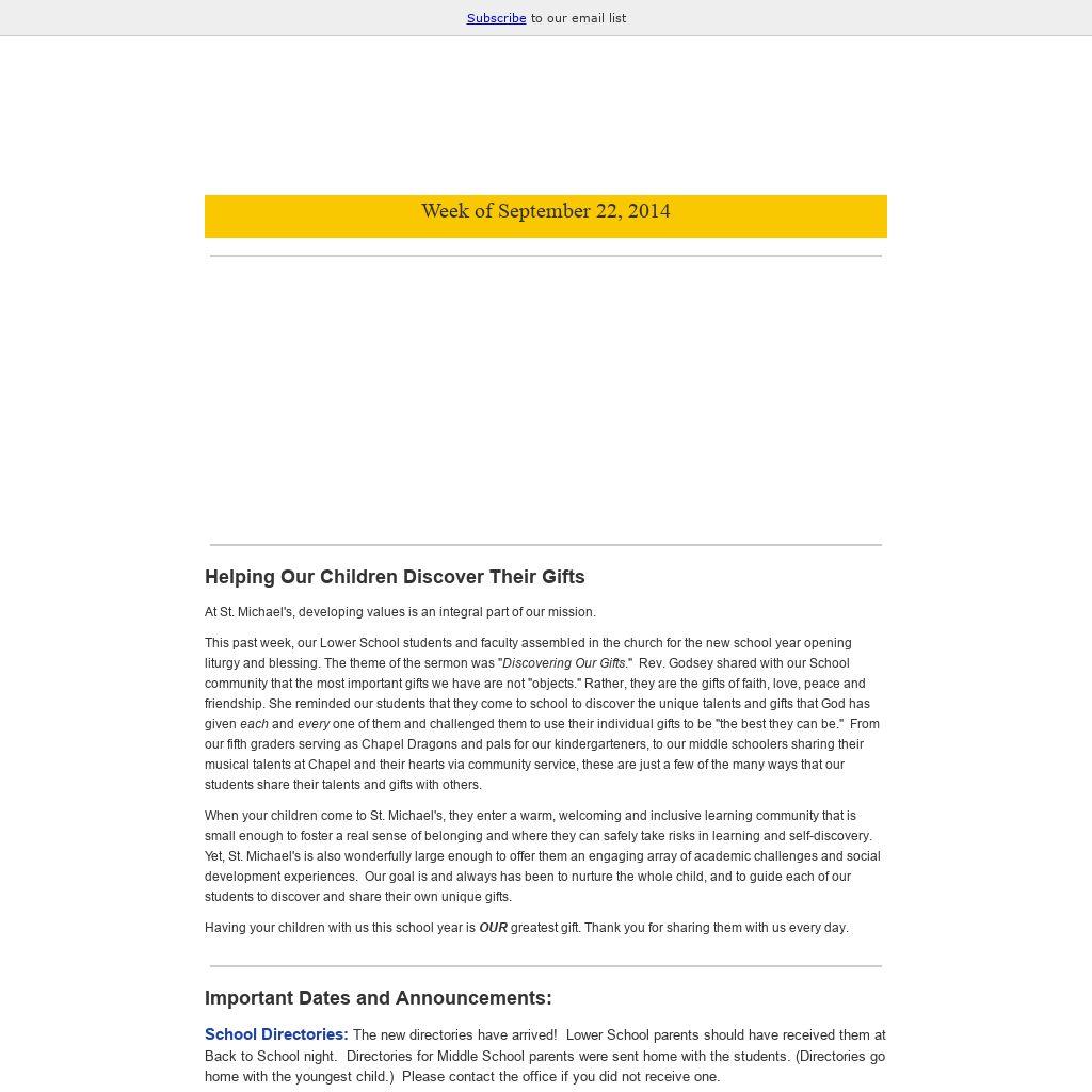When your children come to St. Michael's, they enter a warm, welcoming and inclusive learning community that is small enough to foster a real sense of belonging and where they can safely take risks in learning and self-discovery. Yet, St. Michael's is also wonderfully large enough to offer them an engaging array of academic challenges and social development experiences. Our goal is and always has been to nurture the whole child, and to guide each of our students to discover and share their own unique gifts.