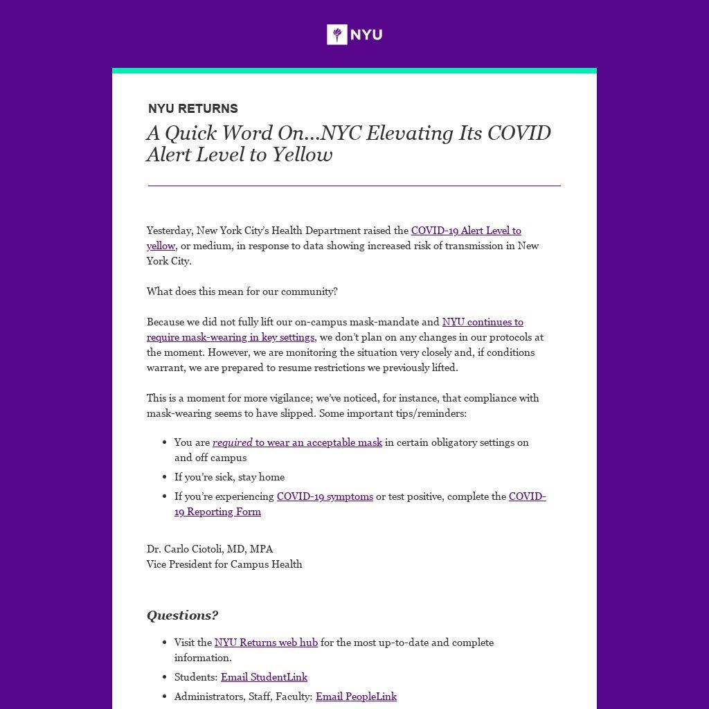 NYU continues to require mask-wearing in key settings, we don’t plan on any changes in our protocols at the moment. However, we are monitoring the situation very closely and, if conditions warrant, we are prepared to resume restrictions we previously lifted.
