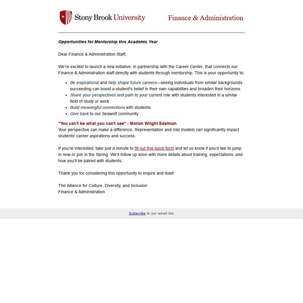 We’re excited to launch a new initiative, in partnership with the Career Center, that connects our Finance & Administration staff directly with students through mentorship. This is your opportunity to: