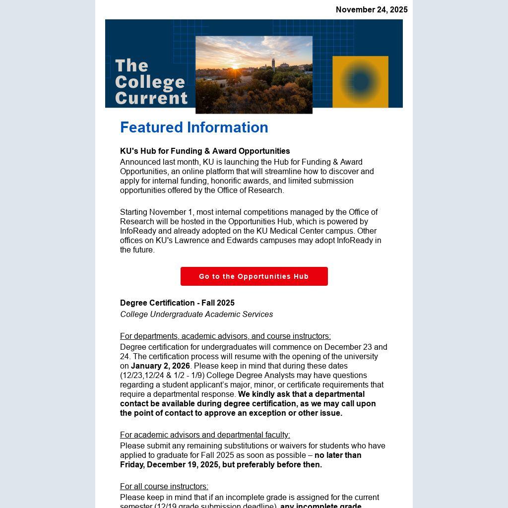 Announced last month, KU is launching the Hub for Funding & Award Opportunities, an online platform that will streamline how to discover and apply for internal funding, honorific awards, and limited submission opportunities offered by the Office of Research.