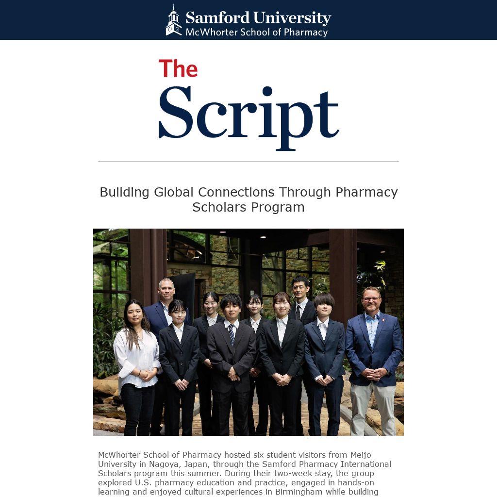 McWhorter School of Pharmacy hosted six student visitors from Meijo University in Nagoya, Japan, through the Samford Pharmacy International Scholars program this summer. During their two-week stay, the group explored U.S. pharmacy education and practice, engaged in hands-on learning and enjoyed cultural experiences in Birmingham while building meaningful connections with Samford students.
