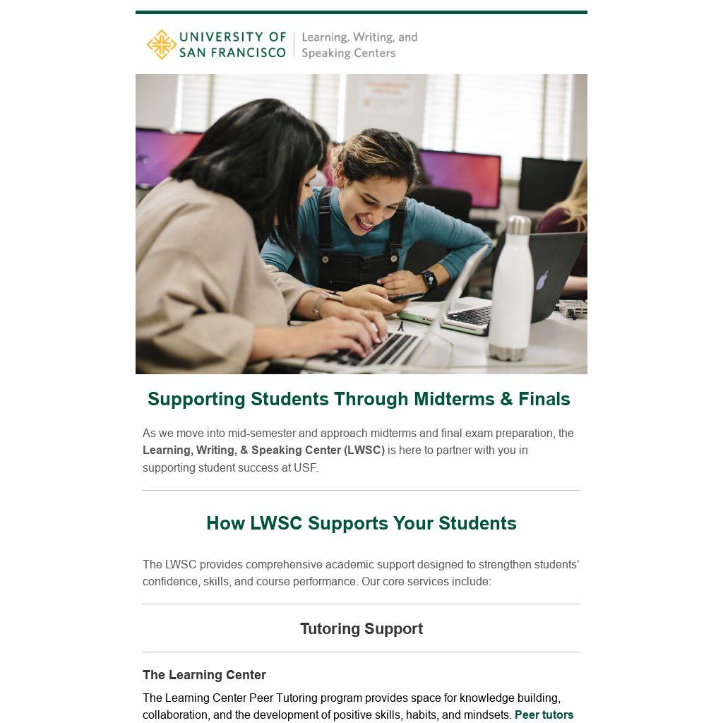As we move into mid-semester and approach midterms and final exam preparation, the Learning, Writing, & Speaking Center (LWSC) is here to partner with you in supporting student success at USF.
