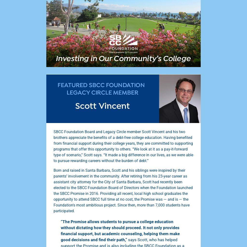 Thanks to Legacy Circle members like Scott Vincent who include gifts to the SBCC Foundation in their estate plans, Santa Barbara City College and its students will continue to thrive for years to come.