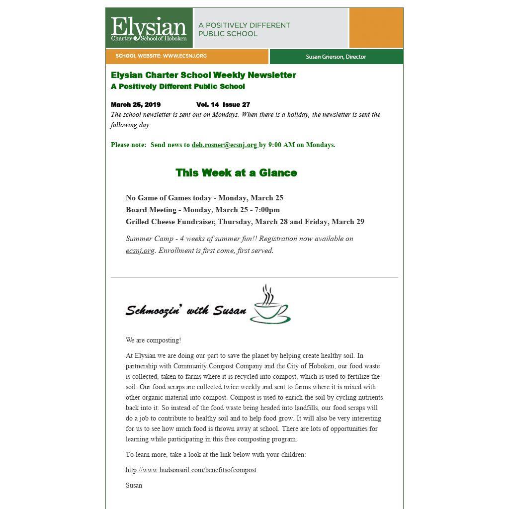 We are composting! At Elysian we are doing our part to save the planet by helping create healthy soil. In partnership with Community Compost Company and the City of Hoboken, our food waste is collected, taken to farms where it is recycled into compost, which is used to fertilize the soil. Our food scraps are collected twice weekly and sent to farms where it is mixed with other organic material into compost. Compost is used to enrich the soil by cycling nutrients back into it. So instead of the food waste being headed into landfills, our food scraps will do a job to contribute to healthy soil and to help food grow. It will also be very interesting for us to see how much food is thrown away at school. There are lots of opportunities for learning while participating in this free composting program. To learn more, take a look at the link below with your children: Susan