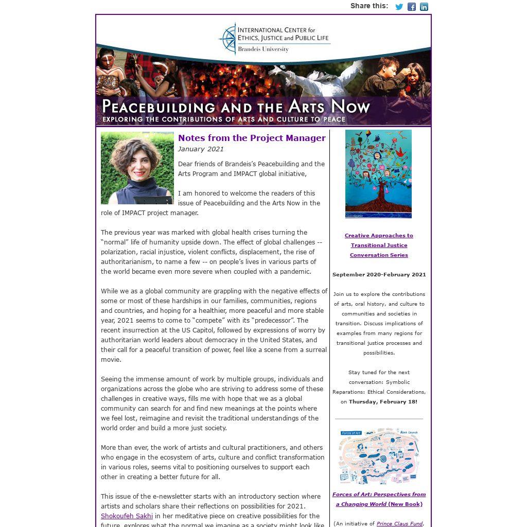 Dear friends of Brandeis’s Peacebuilding and the Arts Program and IMPACT global initiative,