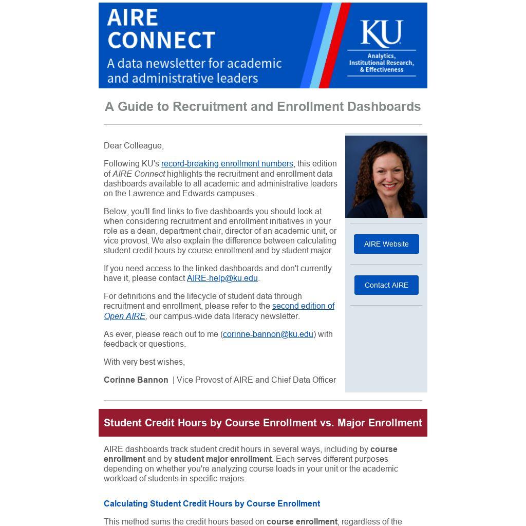 Following KU's record-breaking enrollment numbers, this edition of AIRE Connect highlights the recruitment and enrollment data dashboards available to all academic and administrative leaders on the Lawrence and Edwards campuses.