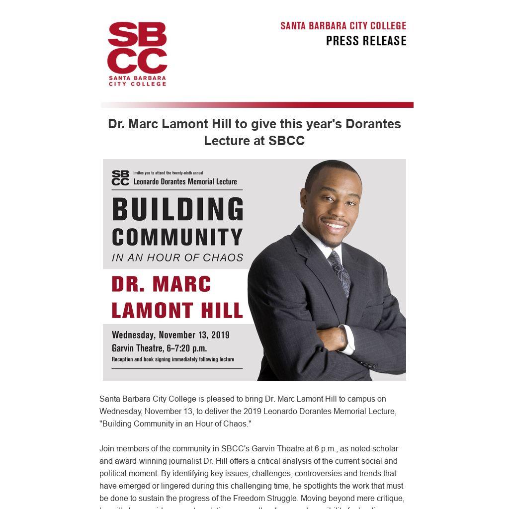 Santa Barbara City College is pleased to bring Dr. Marc Lamont Hill to campus on Wednesday, November 13, to deliver the 2019 Leonardo Dorantes Memorial Lecture, "Building Community in an Hour of Chaos."