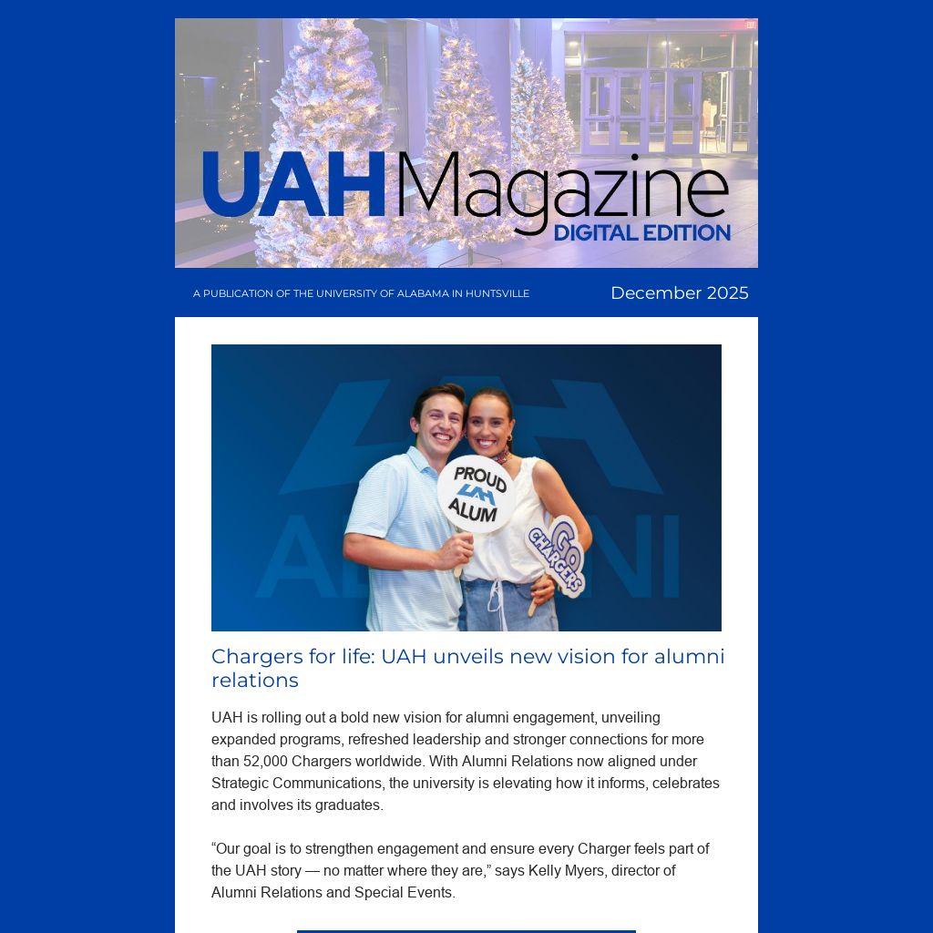 UAH is rolling out a bold new vision for alumni engagement, unveiling expanded programs, refreshed leadership and stronger connections for more than 52,000 Chargers worldwide. With Alumni Relations now aligned under Strategic Communications, the university is elevating how it informs, celebrates and involves its graduates.