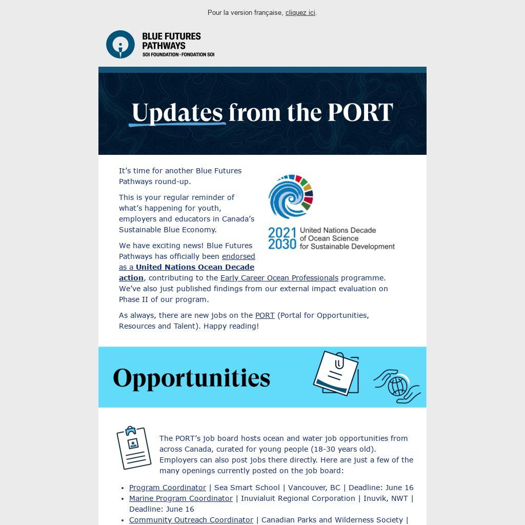 The PORT’s job board hosts ocean and water job opportunities from across Canada, curated for young people (18-30 years old). Employers can also post jobs there directly. Here are just a few of the many openings currently posted on the job board: