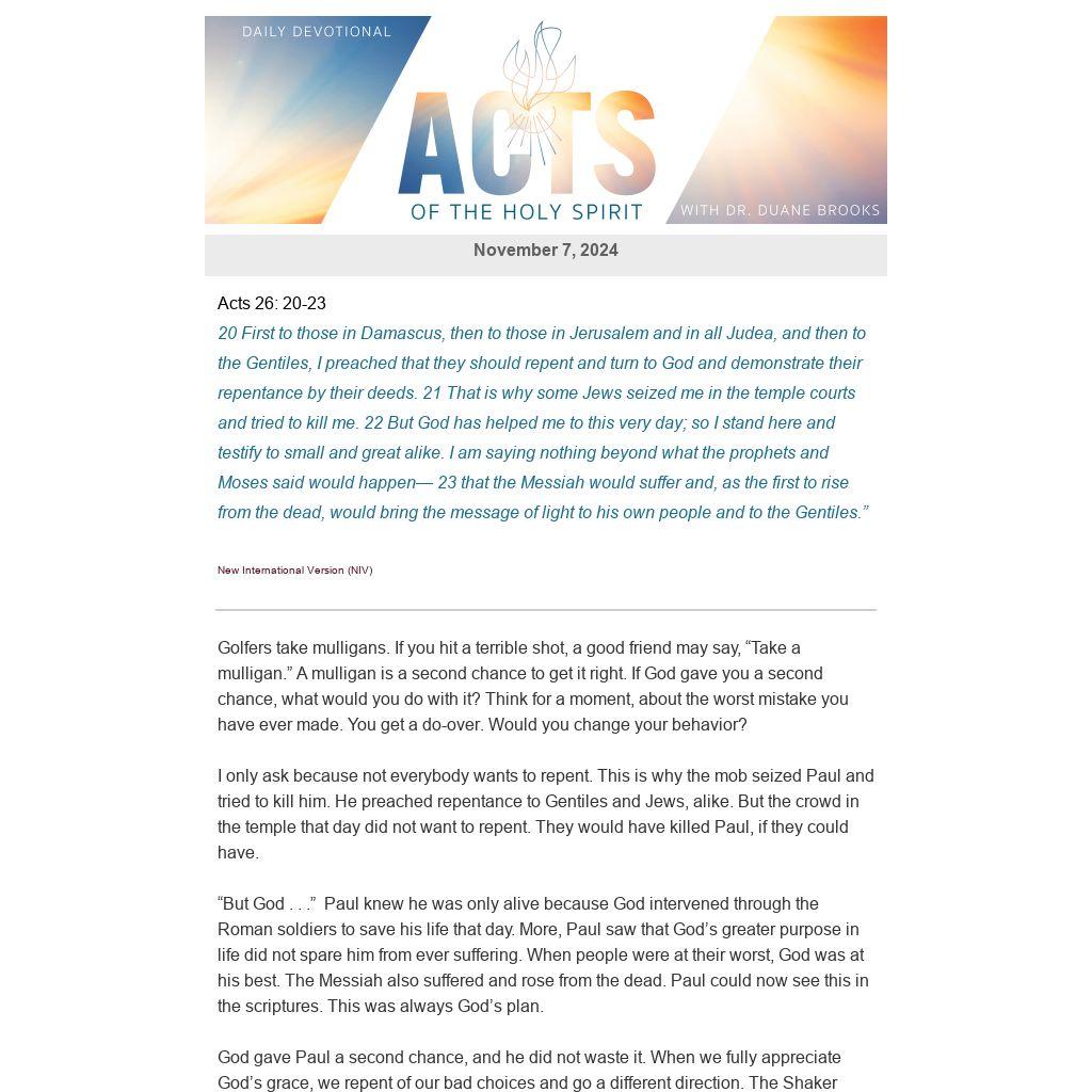 God gave Paul a second chance, and he did not waste it. When we fully appreciate God’s grace, we repent of our bad choices and go a different direction. The Shaker Hymn explains repentance so well: “When true simplicity is gained, to bow and to bend we will not be ashamed. To turn, turn will be our delight, till by turning, turning, we come round right.” Do not waste your mulligan!