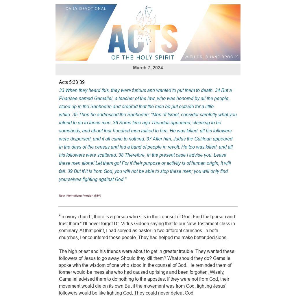Gamaliel was a highly respected Rabbi. At one point, a young man named Saul studied at his feet. The famous Rabbi helped them that day by reminding them that they could not stop the work of God. God loves everyone. But those who sit in his counsel know his heart and speak his mind. In every church, there is someone who listens to God and speaks for him. Who is that person in your community? Knit your soul to that person. Pray with them and listen to their wisdom. It may save you from making a grave mistake.