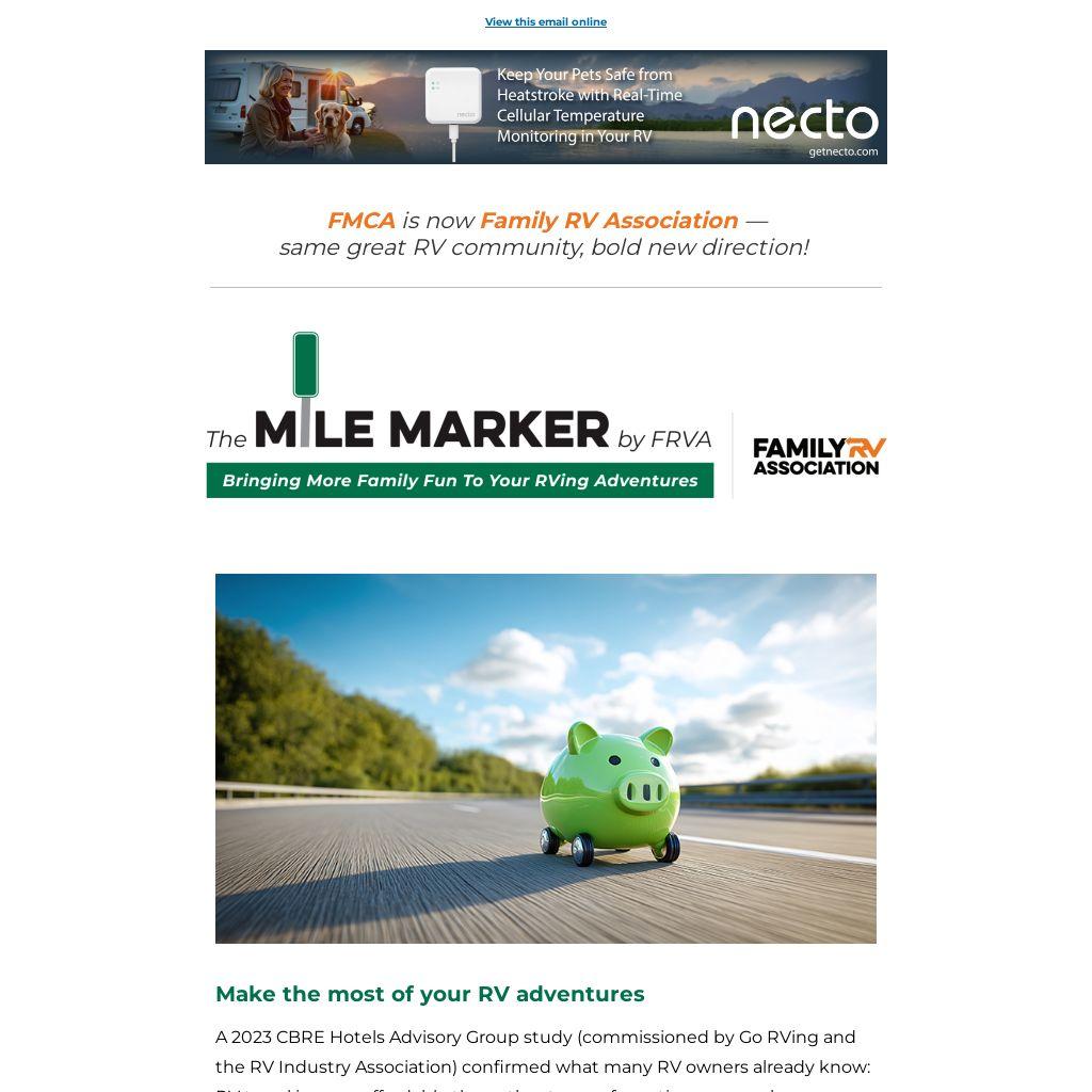 You're in control of your email preferences, and you must be logged into your Family RV Association (previously Family Motor Coach Association/FMCA) membership account to manage your preferences.