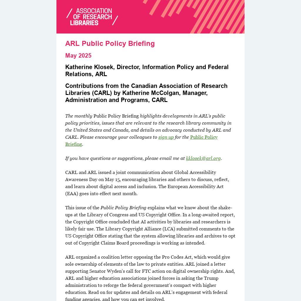 The monthly Public Policy Briefing highlights developments in ARL’s public policy priorities, issues that are relevant to the research library community in the United States and Canada, and details on advocacy conducted by ARL and CARL. Please encourage your colleagues to sign up for the Public Policy Briefing.