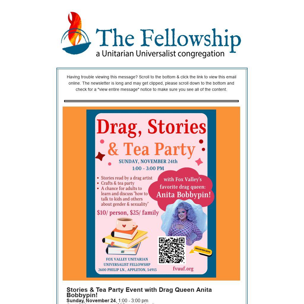 Join us for an afternoon of stories, learning, connection, and fun with a tea party! We will welcome Fox Valley’s favorite drag queen, Anita Bobbypin, to share stories with us. Then, for an hour, kids are welcome to join Anita and some Fellowship adults to prepare for a tea party celebration. They’ll get to know Anita, ask her questions, and interact as they make crowns and tiaras, enjoy face paint, and decorate cookies. Meanwhile, the adults will join Rev. Christina and Fellowship member Amanda Kramp (who is a local award-winning burlesque performer, who goes by the stage name Daisy Chains) to discuss how to talk to others in our lives, kids and adults, about gender and sexuality diversity. Afterward, we will all join together for a celebratory tea party with tea and cookies.