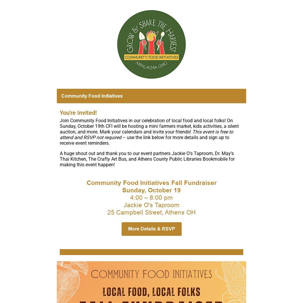 Are you a local business, farmer, artist, or community member who would like to contribute to the Local Food, Local Folks Fall Fundraiser? Please contact Sarah at cfi@communityfoodinitiatives.org to sponsor the event or donate an item for the silent auction. Thank you!