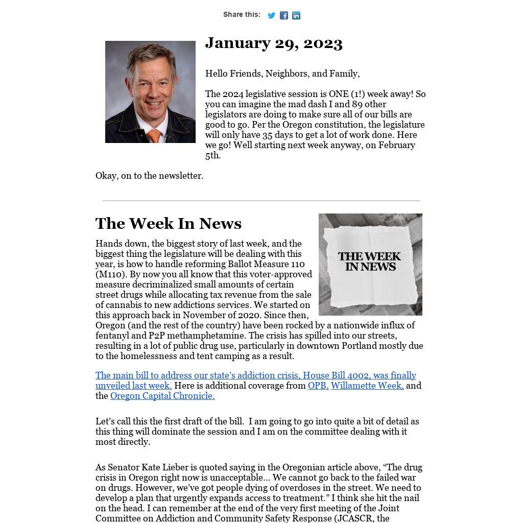 The Week In NewsHands down, the biggest story of last week, and the biggest thing the legislature will be dealing with this year, is how to handle reforming Ballot Measure 110 (M110). By now you all know that this voter-approved measure decriminalized small amounts of certain street drugs while allocating tax revenue from the sale of cannabis to new addictions services. We started on this approach back in November of 2020. Since then, Oregon (and the rest of the country) have been rocked by a nationwide influx of fentanyl and P2P methamphetamine. The crisis has spilled into our streets, resulting in a lot of public drug use, particularly in downtown Portland mostly due to the homelessness and tent camping as a result.