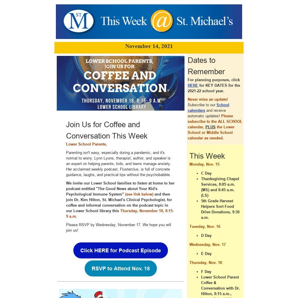 We invite our Lower School families to listen at home to her podcast entitled "The Good News about Your Kid's Psychological Immune System" (see link below) and then join Dr. Kim Hilton, St. Michael's Clinical Psychologist, for coffee and informal conversation on the podcast topic in our Lower School library this Thursday, November 18, 8:15-9 a.m.