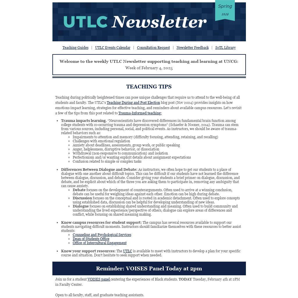 Welcome to the weekly UTLC Newsletter supporting teaching and learning at UNCG: