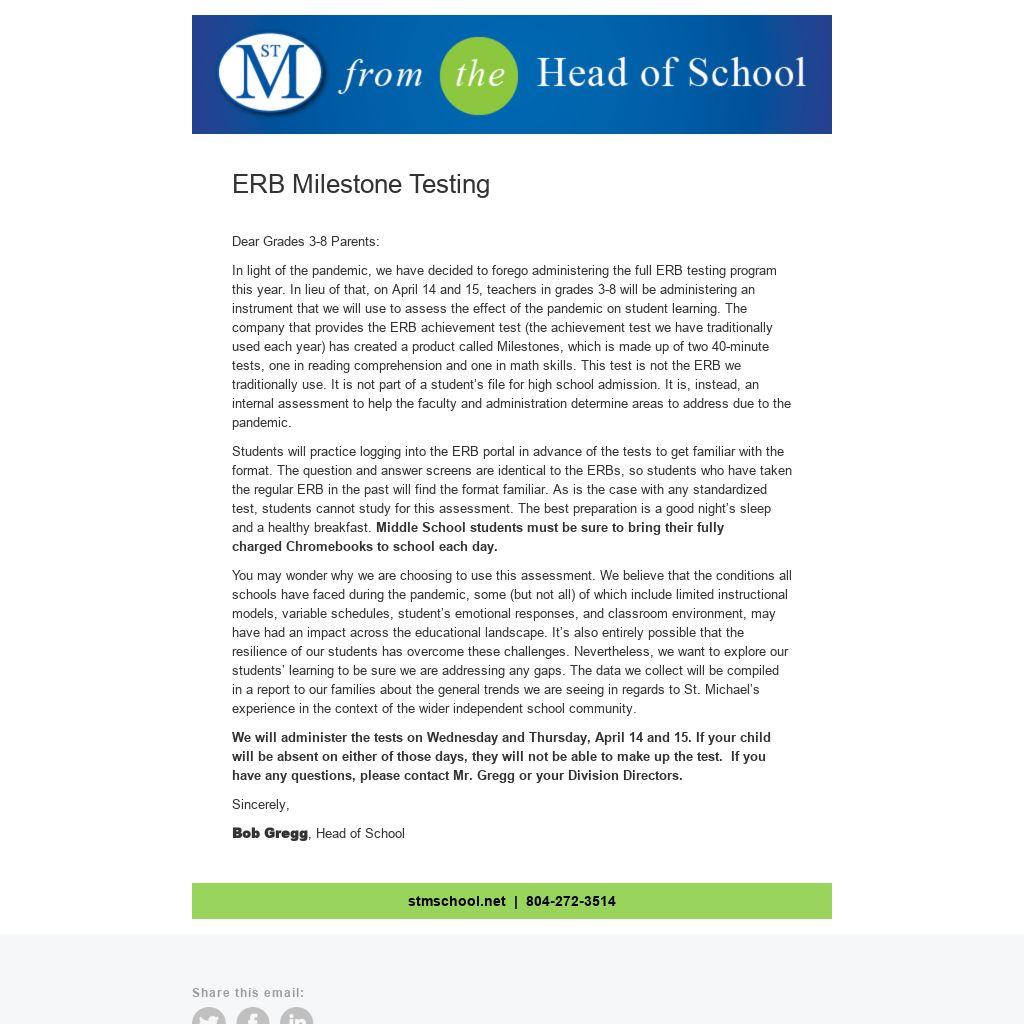 In light of the pandemic, we have decided to forego administering the full ERB testing program this year. In lieu of that, on April 14 and 15, teachers in grades 3-8 will be administering an instrument that we will use to assess the effect of the pandemic on student learning. The company that provides the ERB achievement test (the achievement test we have traditionally used each year) has created a product called Milestones, which is made up of two 40-minute tests, one in reading comprehension and one in math skills. This test is not the ERB we traditionally use. It is not part of a student’s file for high school admission. It is, instead, an internal assessment to help the faculty and administration determine areas to address due to the pandemic.