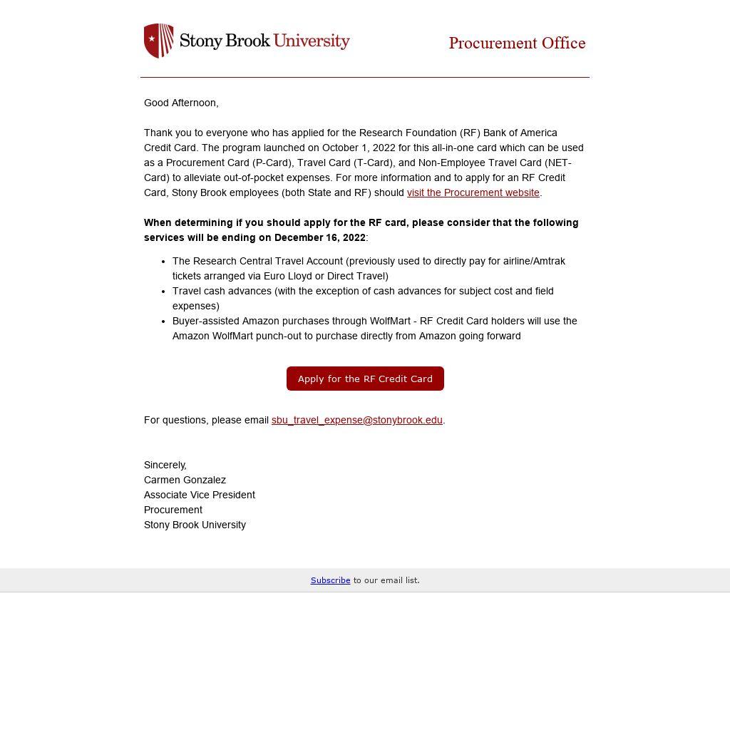 Thank you to everyone who has applied for the Research Foundation (RF) Bank of America Credit Card. The program launched on October 1, 2022 for this all-in-one card which can be used as a Procurement Card (P-Card), Travel Card (T-Card), and Non-Employee Travel Card (NET-Card) to alleviate out-of-pocket expenses. For more information and to apply for an RF Credit Card, Stony Brook employees (both State and RF) should visit the Procurement website.