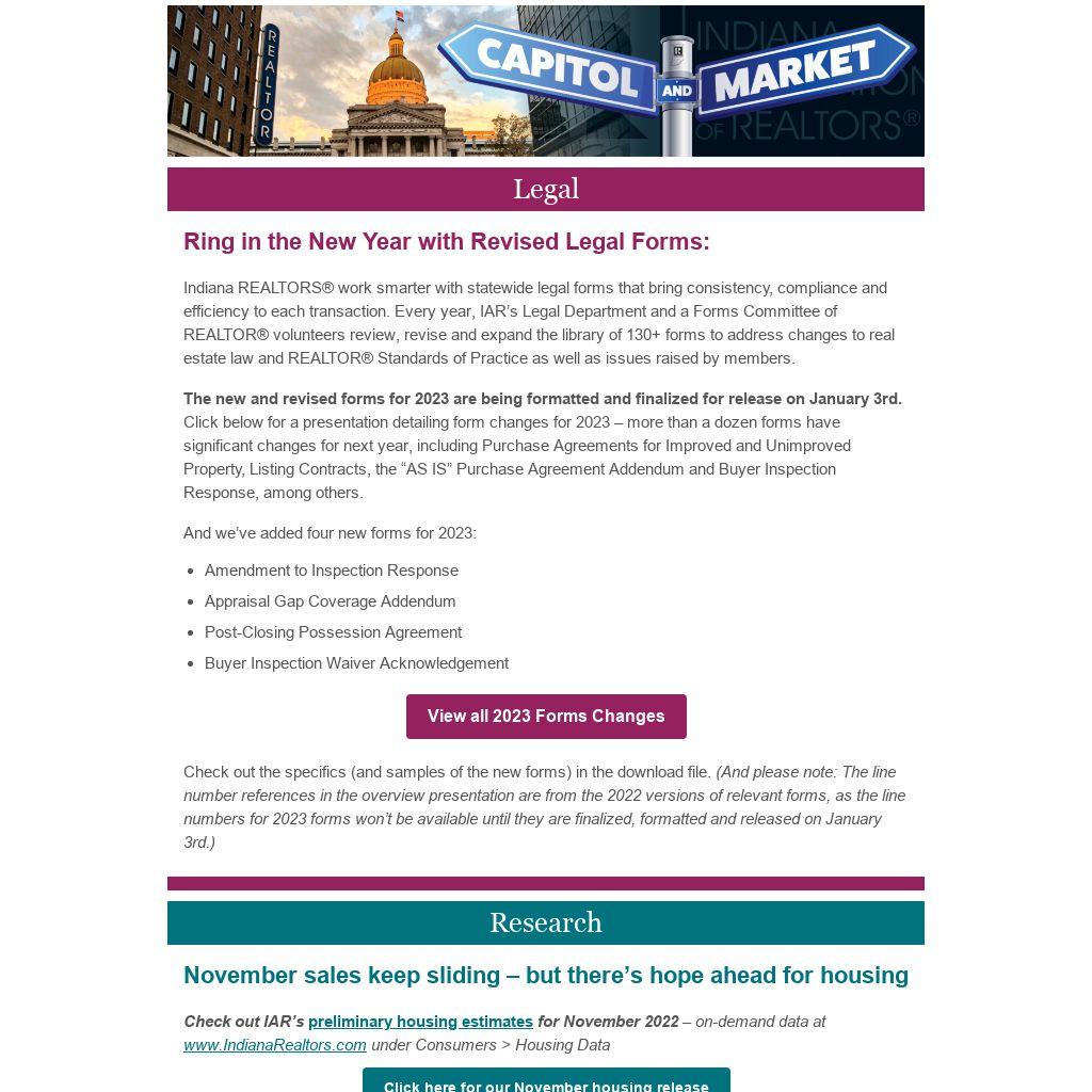 - Indiana Real Estate Law & Practice – IAR’s legal team hasn’t just been hard at work updating our library of transactional forms – they also put together this course on the latest legal developments and emerging issues that could impact your bottom line.