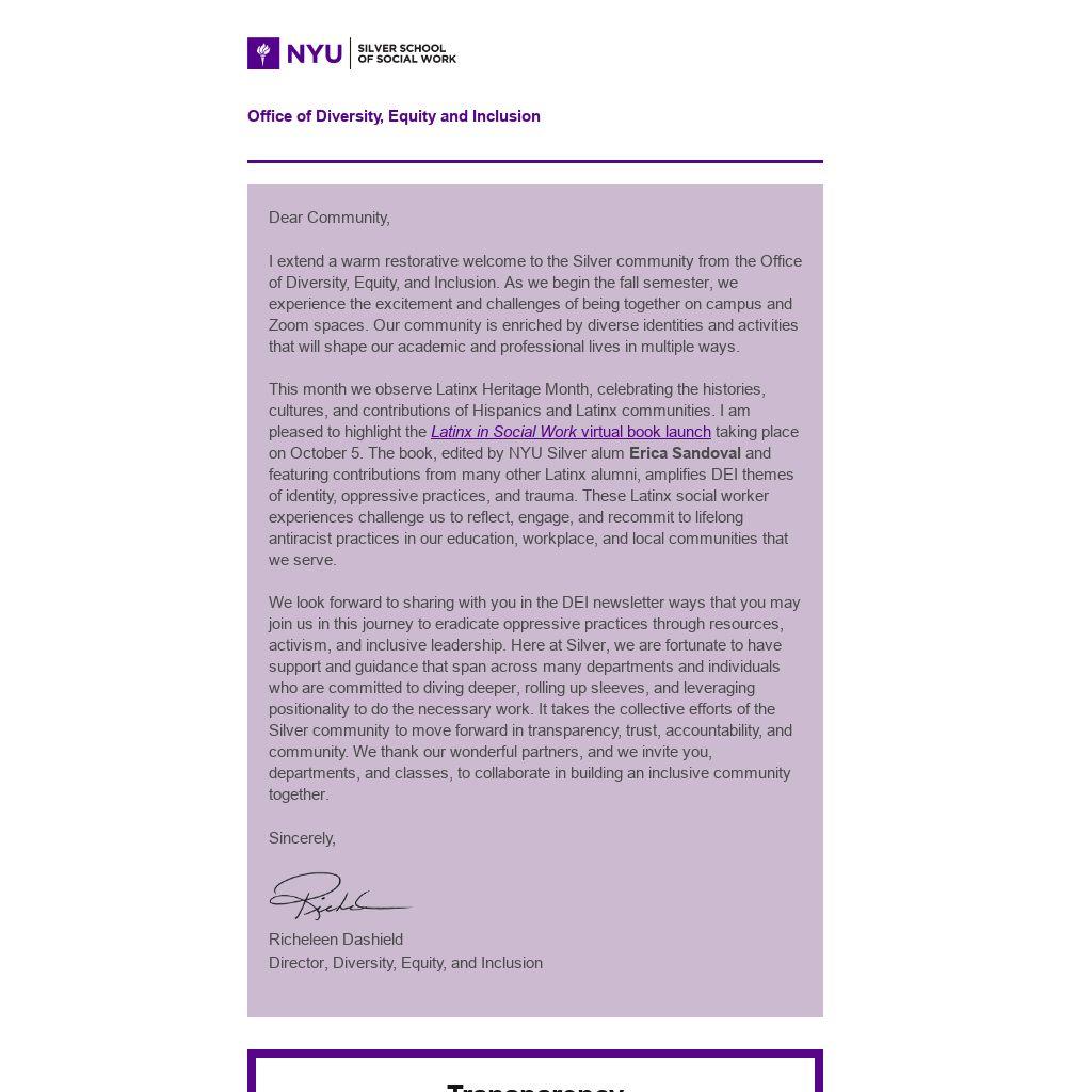 I extend a warm restorative welcome to the Silver community from the Office of Diversity, Equity, and Inclusion. As we begin the fall semester, we experience the excitement and challenges of being together on campus and Zoom spaces. Our community is enriched by diverse identities and activities that will shape our academic and professional lives in multiple ways.